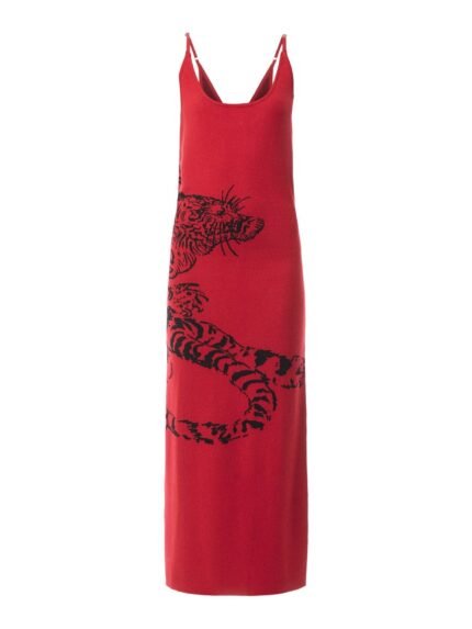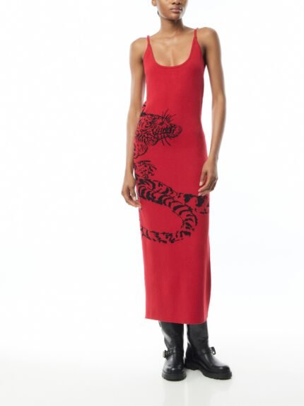 In a striking samba red, this tight-fit maxi dress features an all-over knitted tiger graphic that embodies Ed Hardy’s bold