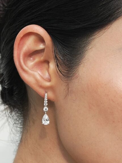 A beautiful staple pair of drop earrings featuring stunning oval cuts accented with tapered round brilliant stones. Finished with an