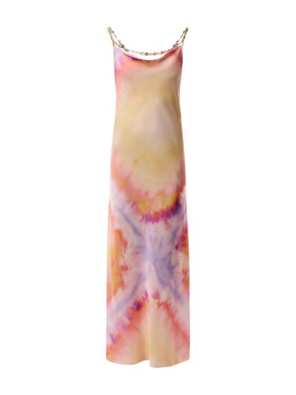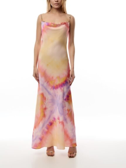 Flowy maxi dress featuring delicate straps and a vibrant tie-dye print, adorned with gold chain accents on the straps and