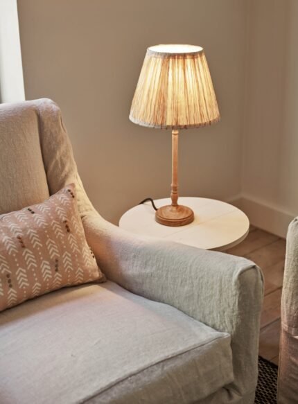 – A small, gathered handmade silk lampshade– Woven from beautifully textured raw Tussar silk– Pale pink silk lining– Dyed using