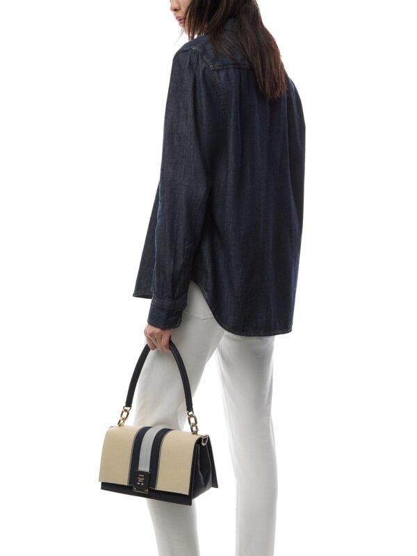 This canvas crossbody bag is a versatile choice for daily outings, featuring a striking striped design and TH monogram plaque.