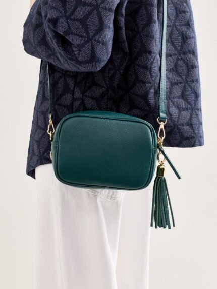 The Tassel Leather Crossbody Bag by Apatchy features a compact silhouette accented with a fluid leather tassel. Its adjustable strap