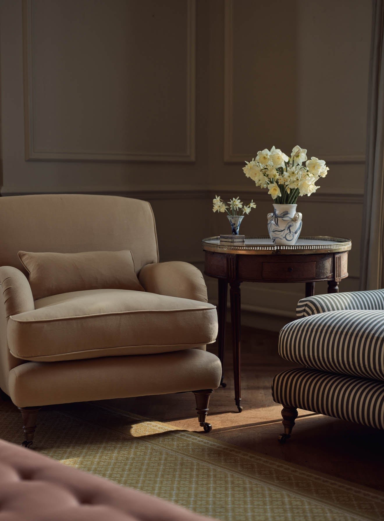 – Upholstered in a warm yet restrained soft yellow cotton with delicate pleat details