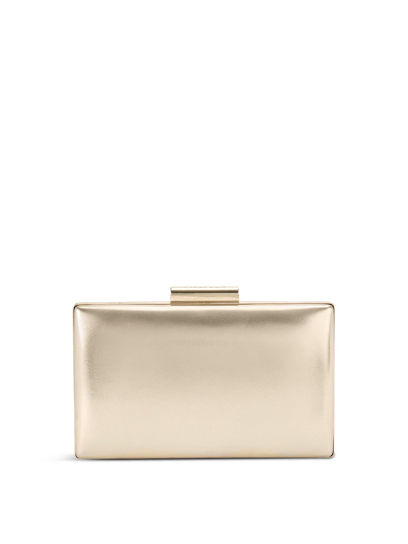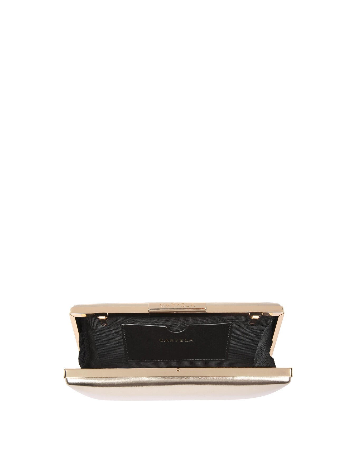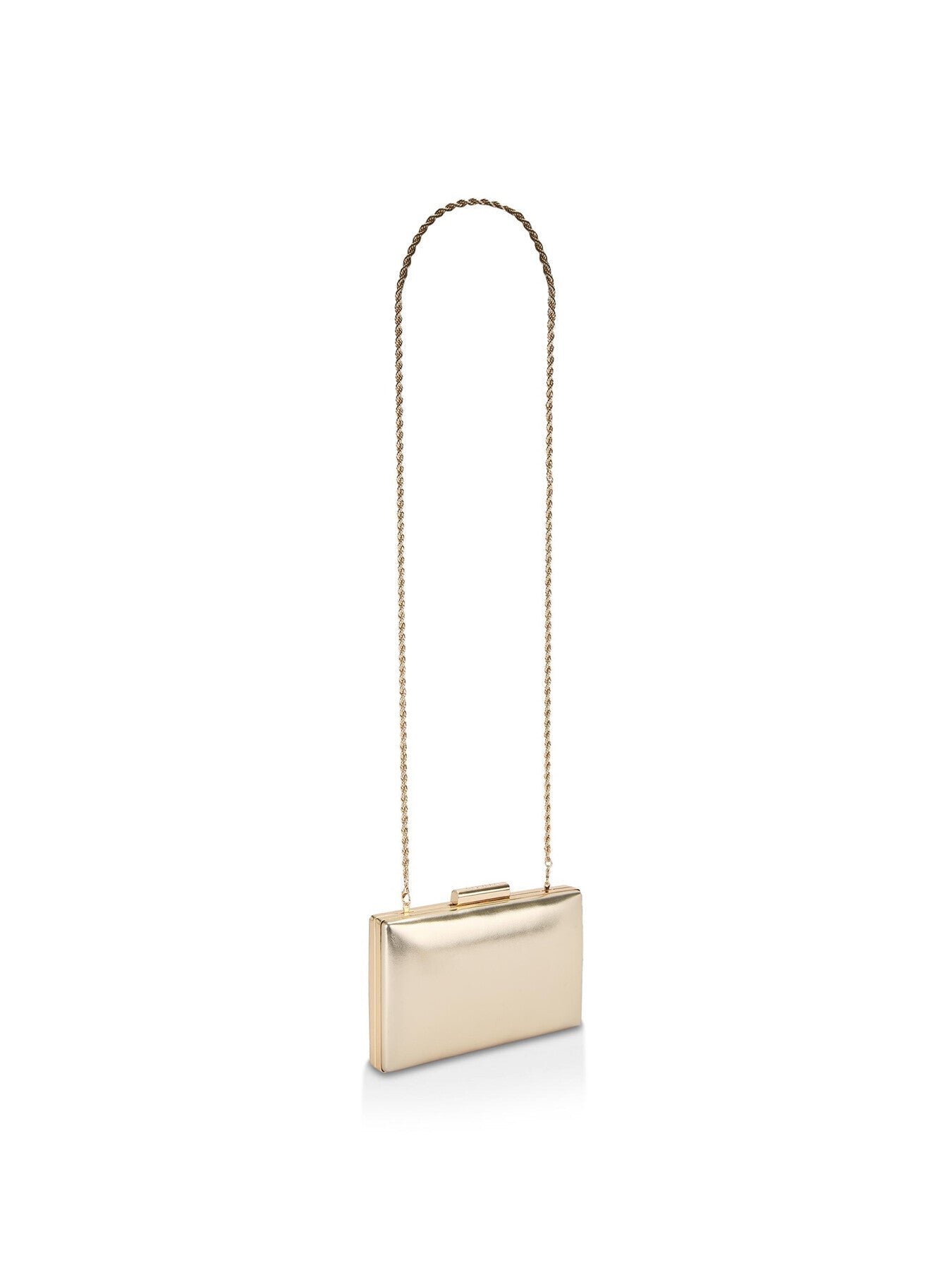 The Carvela Aintree Clutch features a padded gold exterior in a soft leather alternative. The gold snap closure is branded. 12cm (H), 20cm (L), 3cm (D). Strap length: 118cm.