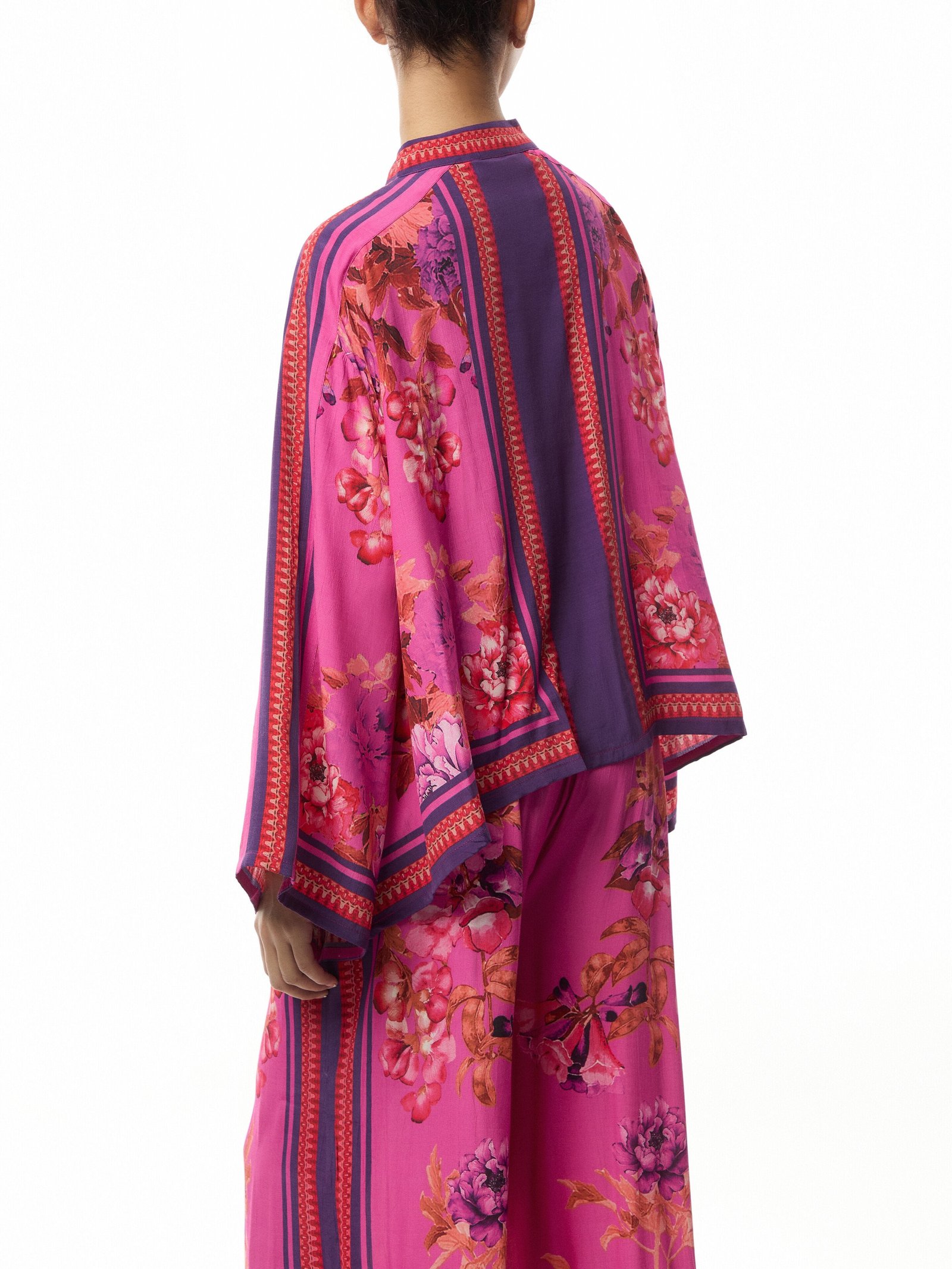 Introducing the Alina Pink Shirt, a vibrant addition to any fashion-forward wardrobe. This statement piece features a bold floral print with a rich fusion of purple and Blue hues, set against a lively pink background. Accented with magenta and Blue trims for a touch of elegance, it has a structured collar and billowing bell sleeves for a chic, modern look. Perfect for brightening up the office or a casual day out.