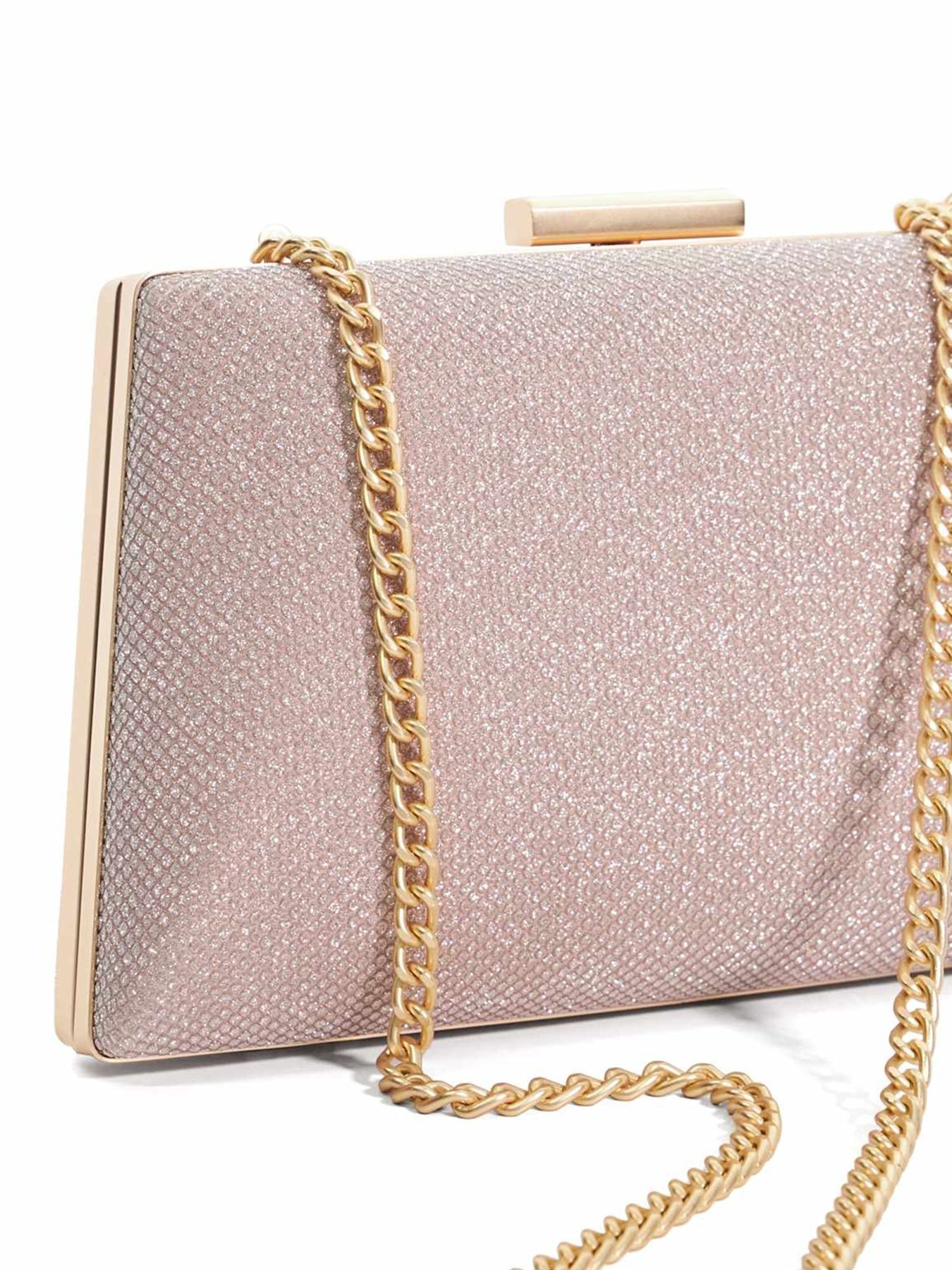 A gold box clutch with top clasp and chain handle, finished with signature jacquard lining for standout occasion styling.