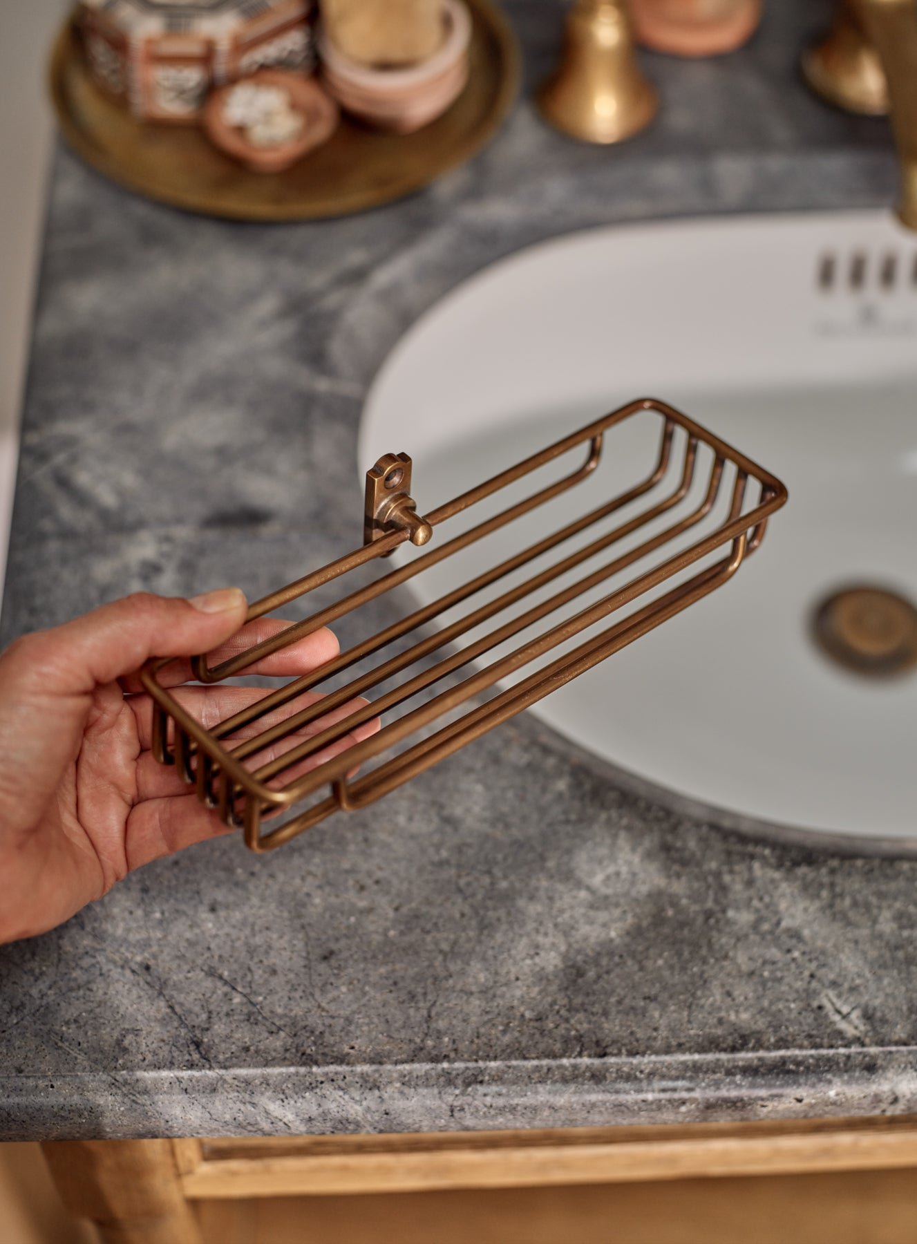 – A beautifully simple perch for soaps and loofahs