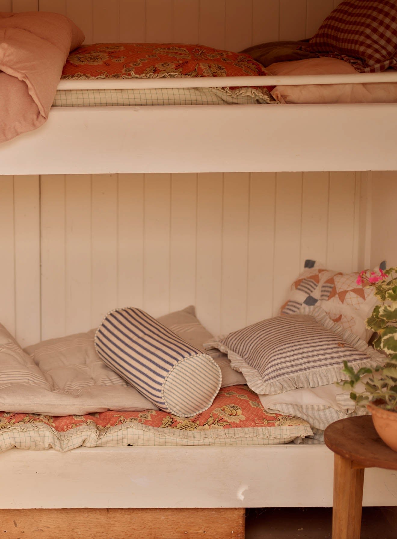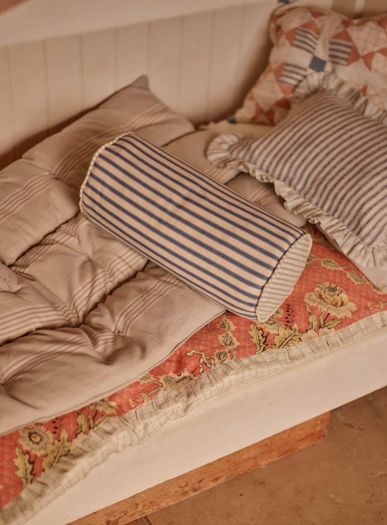 – A charming multi-stripe British-made bolster cushion
