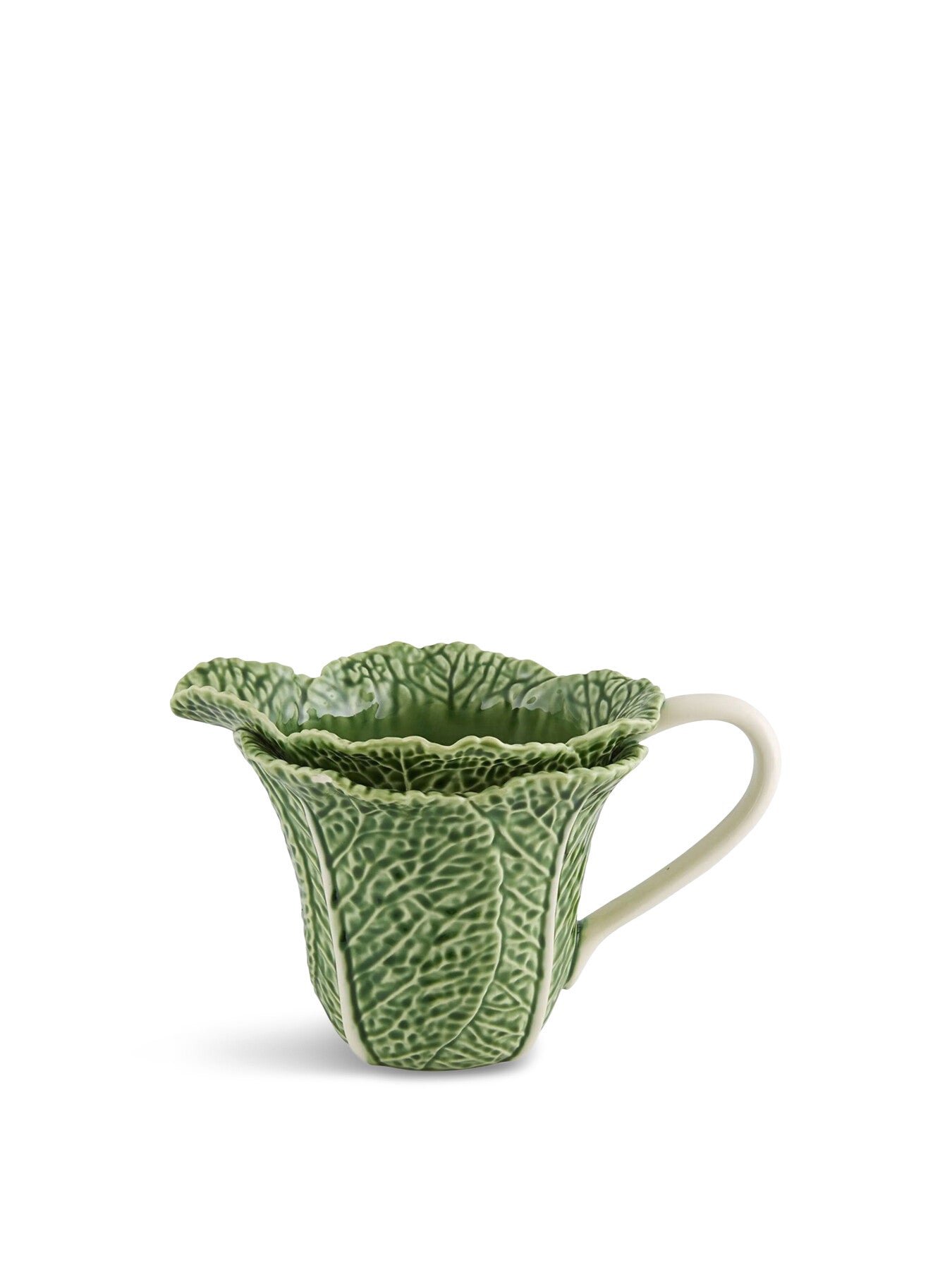 Couve lettuce-look pitcher from Bordallo Pinheiro featuring a green, glazed finish. The jug is created from 100% Earthenware, with a single rounded handle to the side.