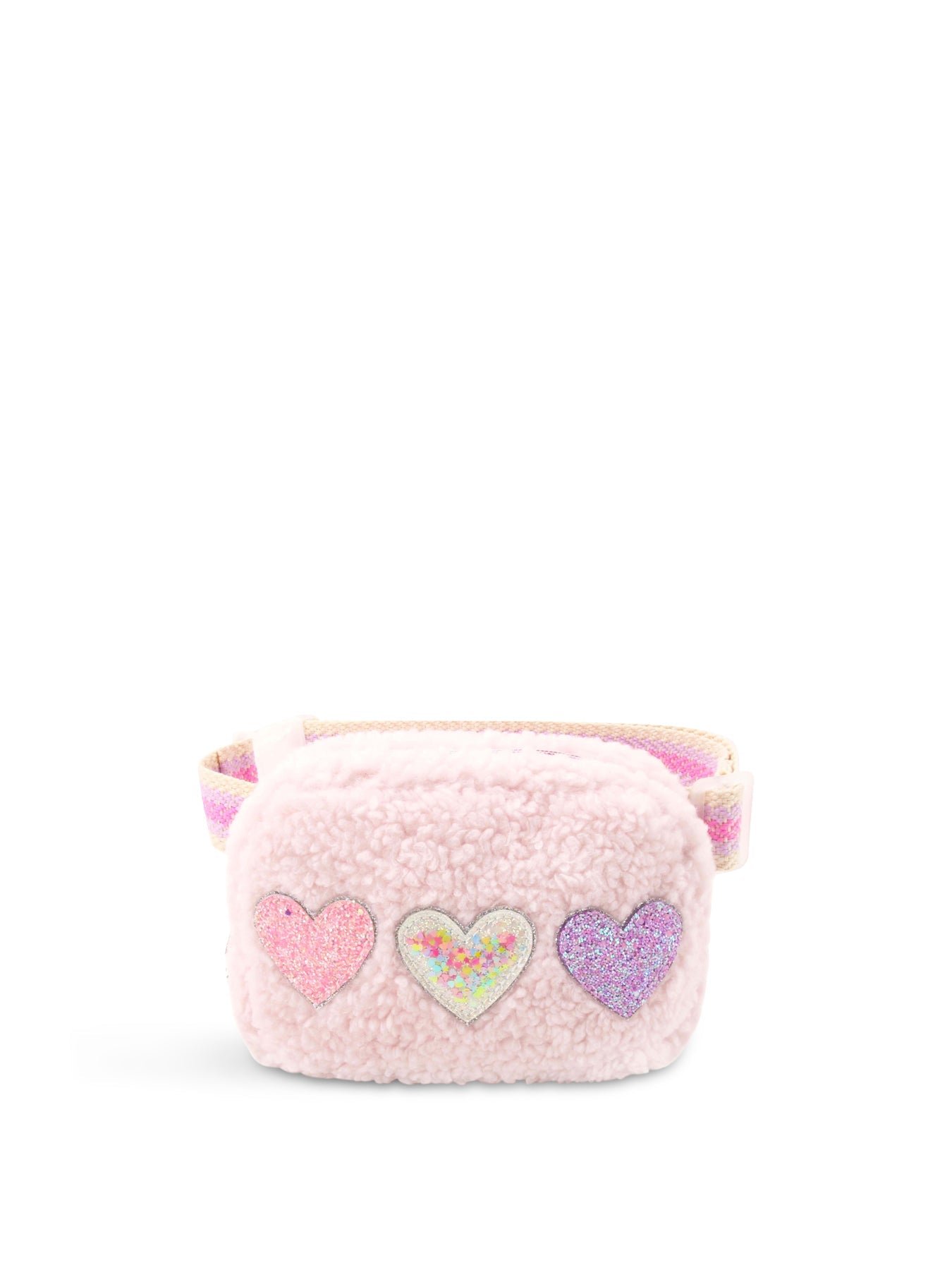 This practical hands-free bag is designed for children to enjoy wearing repeatedly. It can be worn around the waist or across the body, thanks to its adjustable strap. Made from soft pink teddy sherpa material, it is decorated with confetti heart patches.