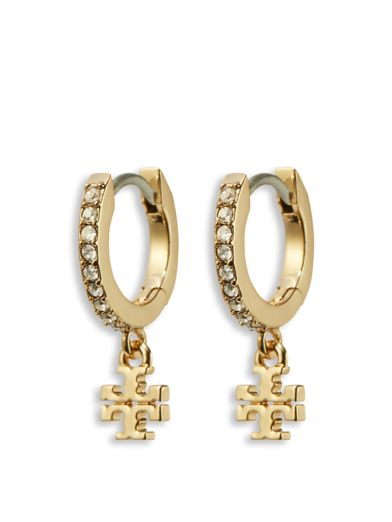 The Eleanor Pavé Huggie Earring combines a small crystal-traced hoop with a Double T charm.