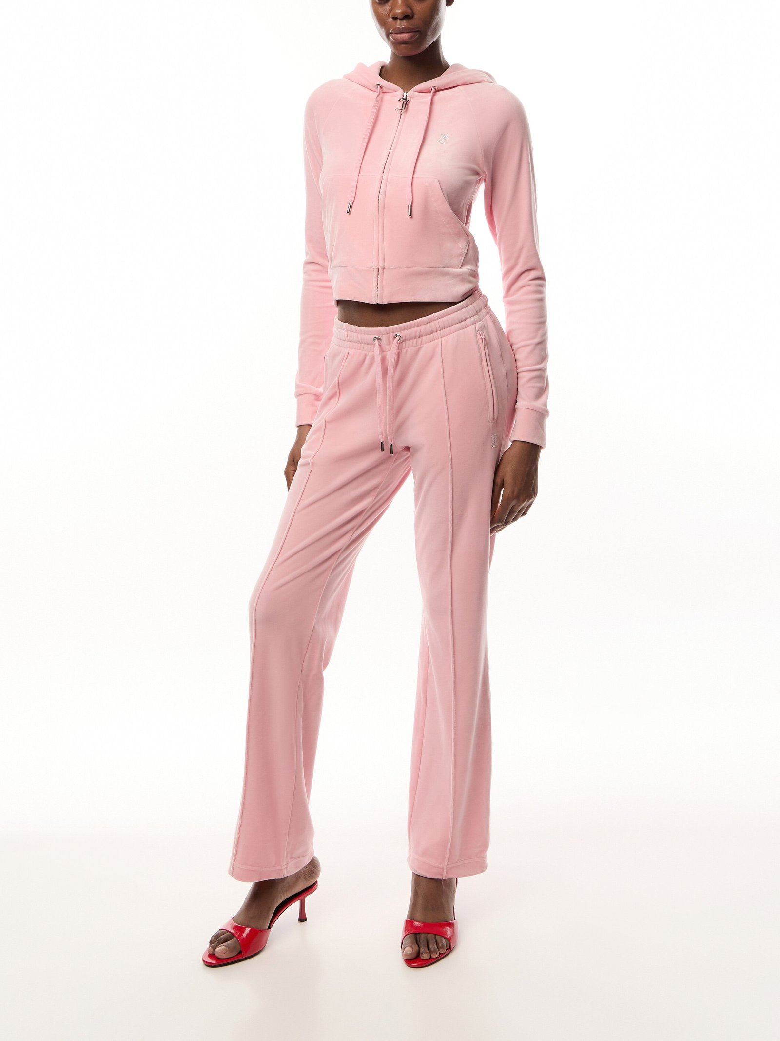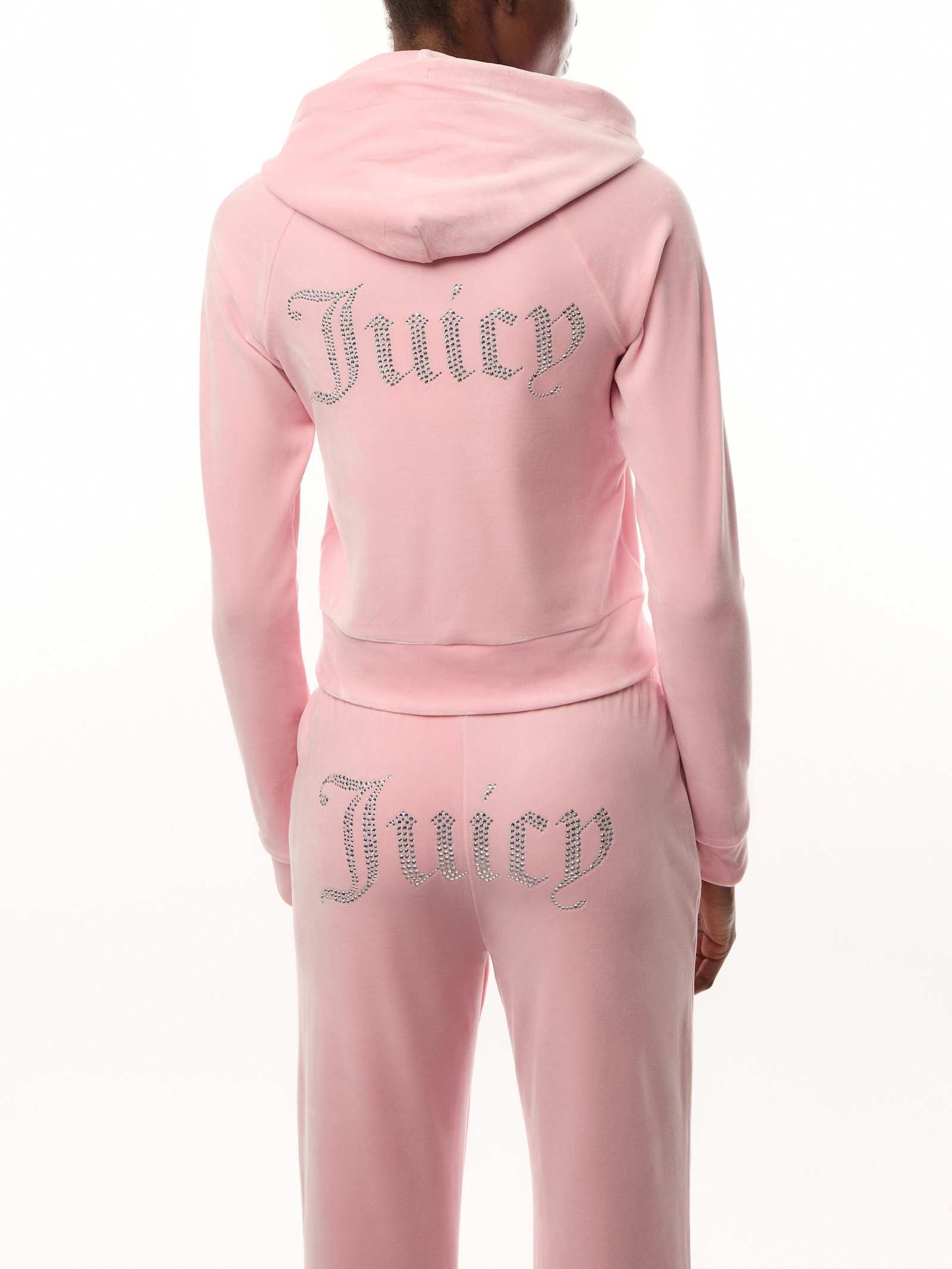 Diamanté embellished hoodie in almond blossom classic velour. Slim fit zip-through style with a hood, front pockets, and a statement crystal diamanté logo branding on the back. This hoodie is finished with a silver gothic J zip pull. Pair with the matching bottoms for a full iconic Juicy Couture tracksuit.