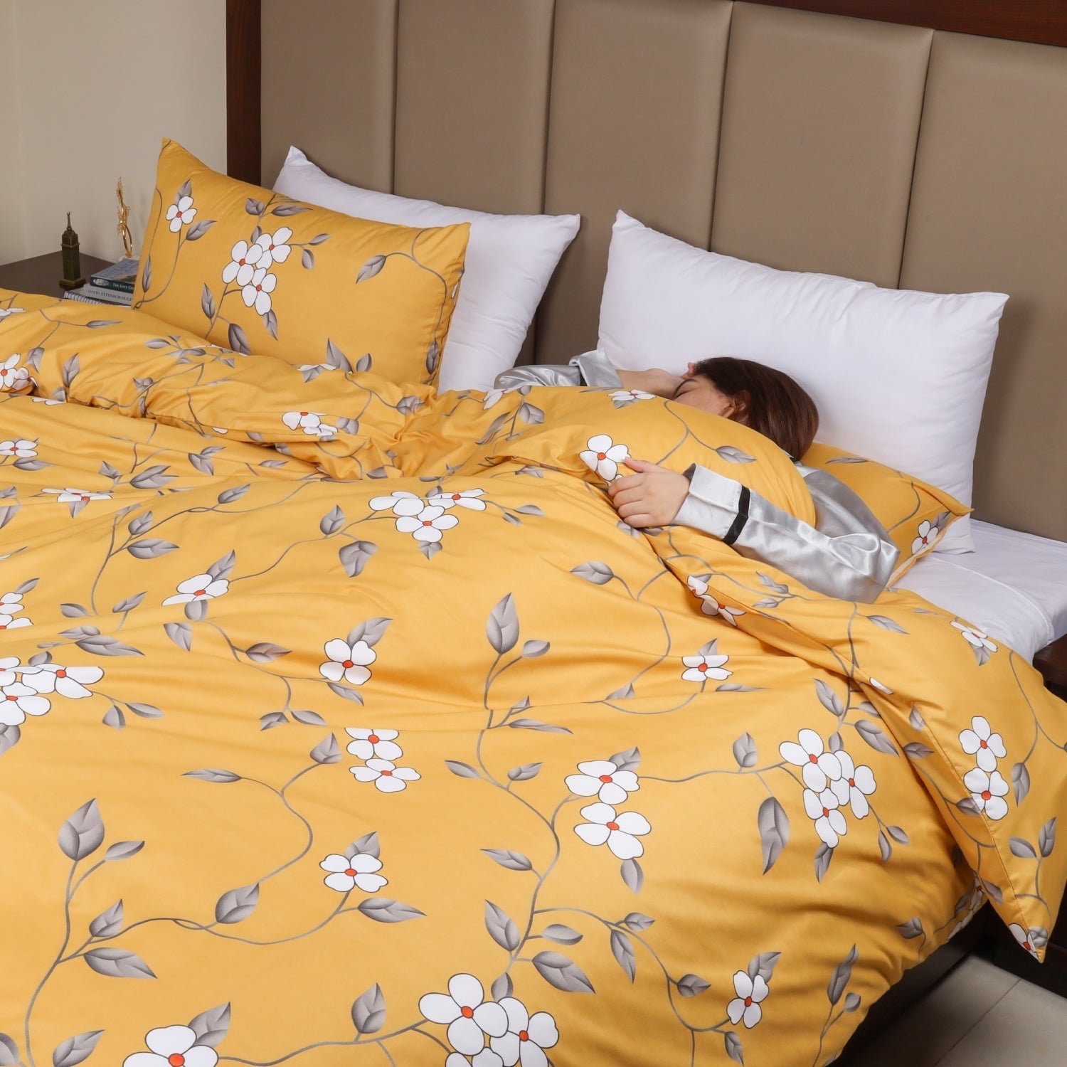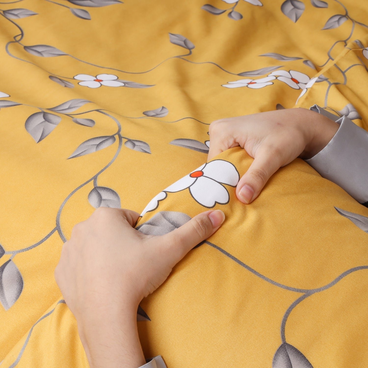 This microfiber grey and Ochre Flower duvet cover set prints is a complete range that makes your bedroom stylish and glorifies it. This Ochre Flower printed bedding feel-good fabric and high-quality duvet cover set come with coordinating pillow covers that have floral themes all over, making an ideal troupe to treat your bed. Internal ties and the closure makes sure that the duvet cover stays in place and prevents slipping. This 3 piece duvet cover set works well on all-season duvets. All you need to do is simply layer your duvet or comforter with this printed duvet cover set and create that peaceful serene place to sleep you have always dreamt of.