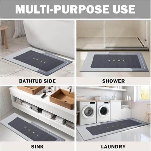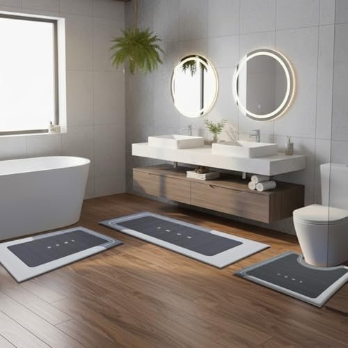 About this item PEDESTAL MAT – Small (50×50 cm) – This size is a wonderful option for compact areas, such as under a single sink or beside a shower. To ensure a seamless fit in your bathroom, consider the layout and dimensions before making your selection. INNOVATIVE DESIGN BATH MAT – The bath mat features an innovative design with four layers crafted from advanced materials, including PVC, technical velvet, and a multi-layer composite diatom mud. This combination not only enhances its absorbency but also allows it to dry significantly faster than traditional floor mats. Additionally, it features a non-slip rubber bottom that ensures a strong grip on various surfaces. RAPID WATER PERMEABILITY ANTI SLIP MAT – The non-slip bath mat is made from foamed diatom mud material, which excels in water absorption and allows for rapid water permeability, preventing moisture accumulation. This keeps your feet dry after bathing, making it an excellent choice for both bathrooms and kitchens. ENHANCED SAFETY – Our product features a specially designed non-slip surface that significantly reduces the risk of slips and falls in the bathroom. This is particularly beneficial for children, elderly individuals, and those with mobility challenges, who may be more susceptible to accidents in wet environments. EASY TO CLEAN – Quick to wipe down and clean, often machine washable. This floor mat is designed for quick drying and is easy to clean. You can simply wash it with water or soap, and hang it to dry. Any dust can be easily removed with a vacuum cleaner.
