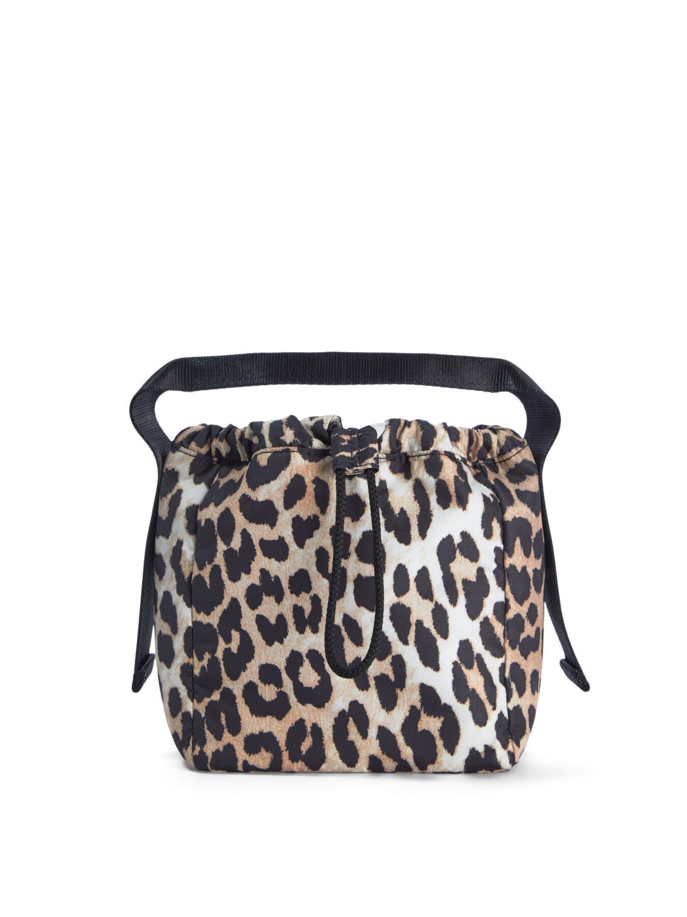 Be environmentally conscious and stylish with the Recycled Tech Pouch Leopard Print. It’s designed with a durable drawstring closure and a chic GANNI logo webbing top handle.