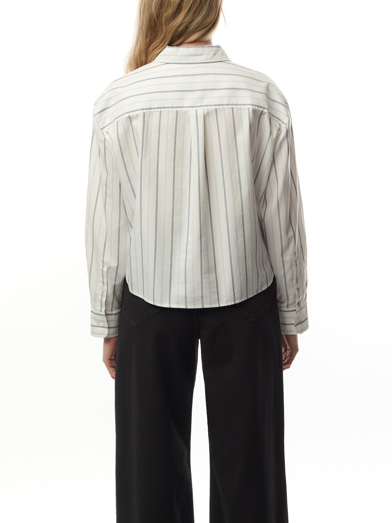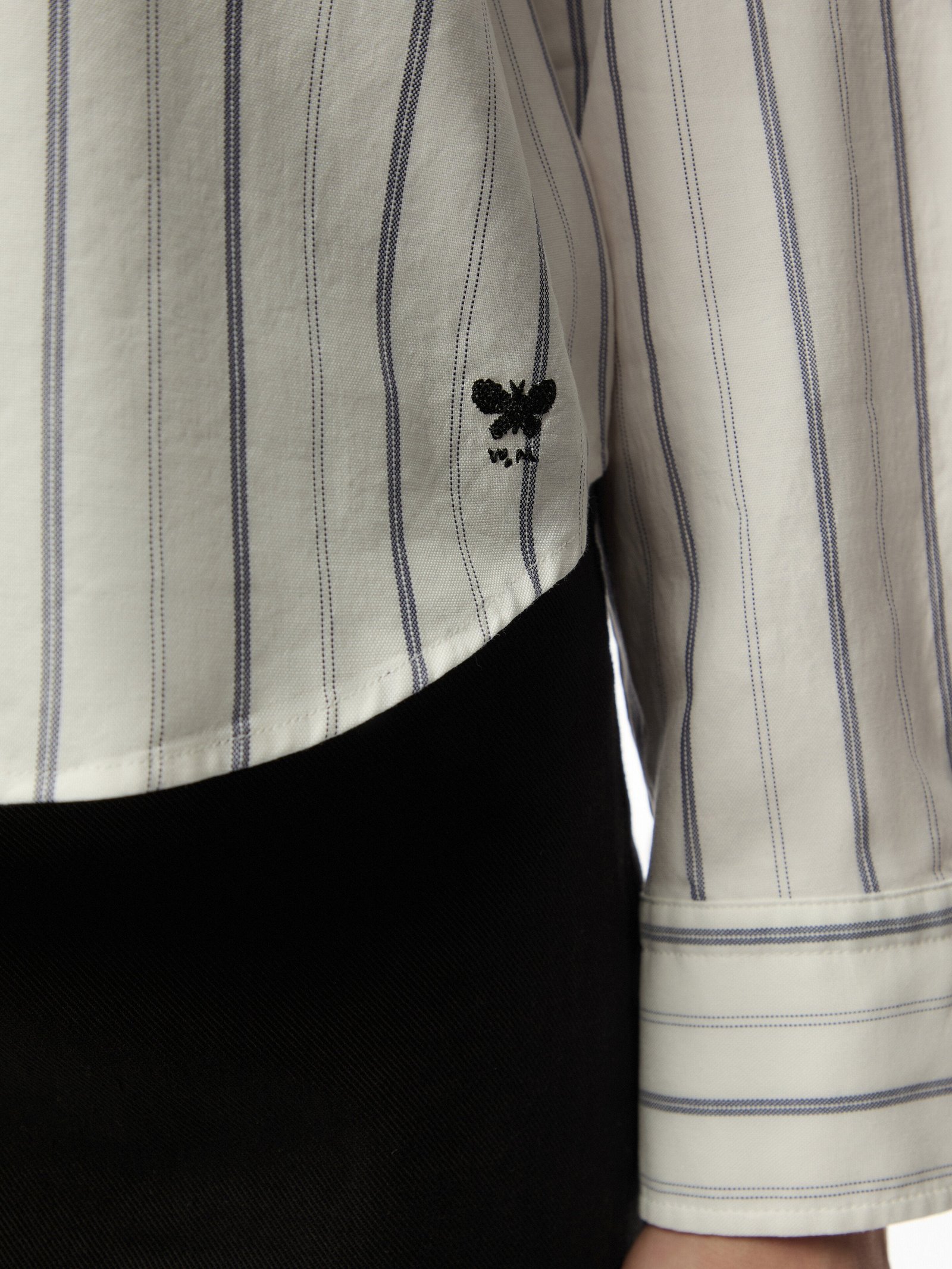 Straight-fit shirt in fine striped cotton Oxford cloth. The classic-style model boasts a mannish collar, patch breast pocket and long cuffed sleeves. Embellished with a darted rear yoke and rounded hem decorated with a small embroidered butterfly logo at the side. Mother-of-pearl button fastening.