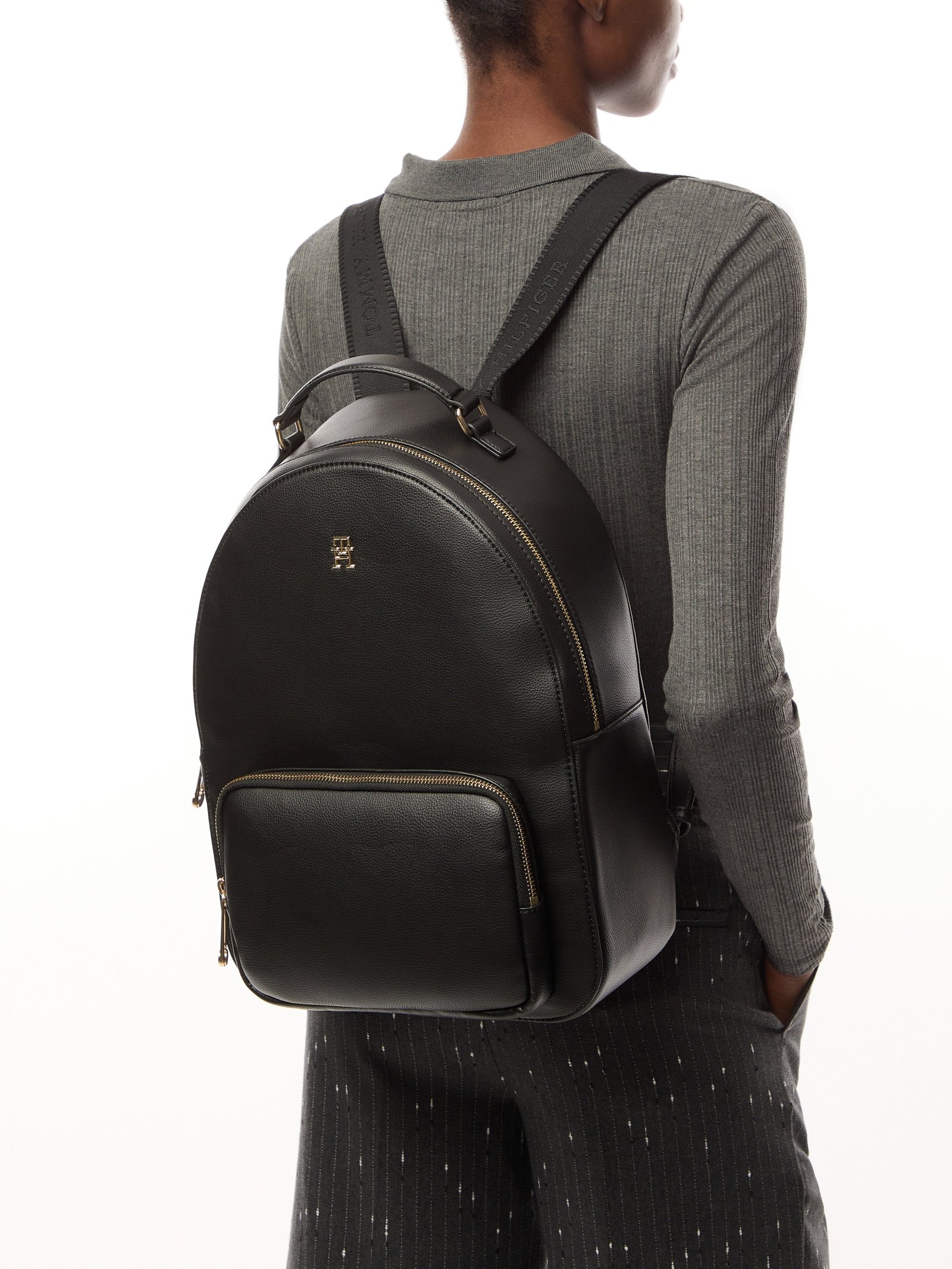 Keep your daily style sophisticated with this refined dome backpack, featuring a pebble-grain finish and sleek TH monogram hardware. Featuring a pebble grain finish, dome design and zip closure.