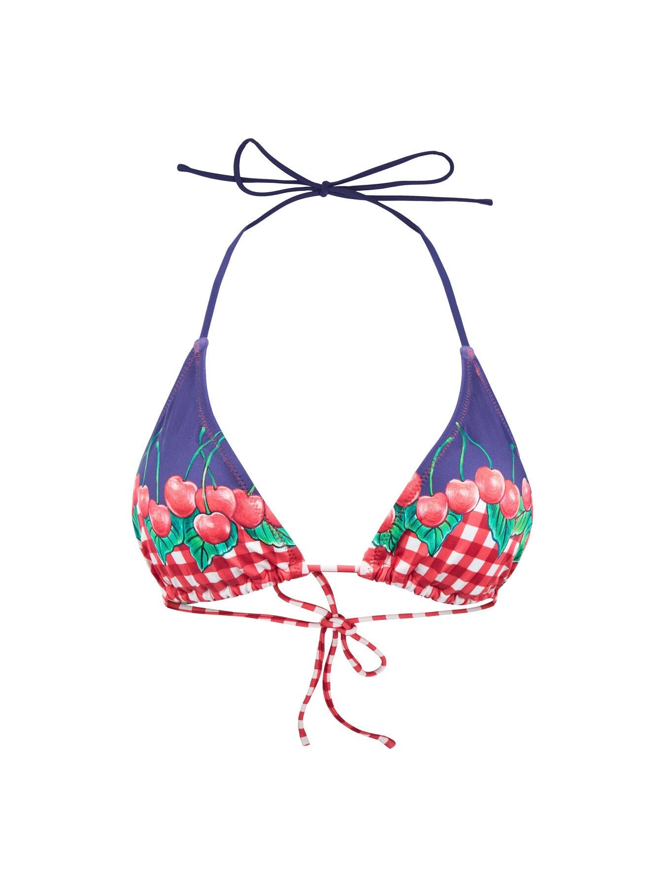 Upgrade your holiday look with our Triangle Bikini Top in custom cherry pie print. Designed with removable padded cups, and neck and back ties, this bikini top fuses comfort and style. Matching Tie Side Bikini Bottoms available.