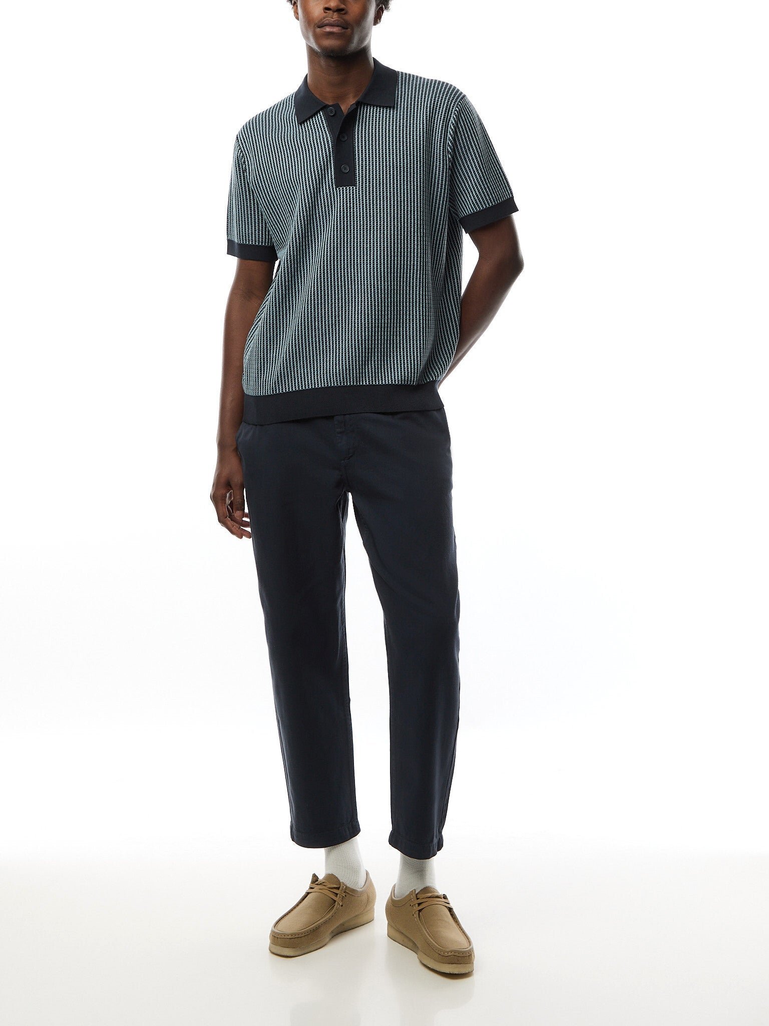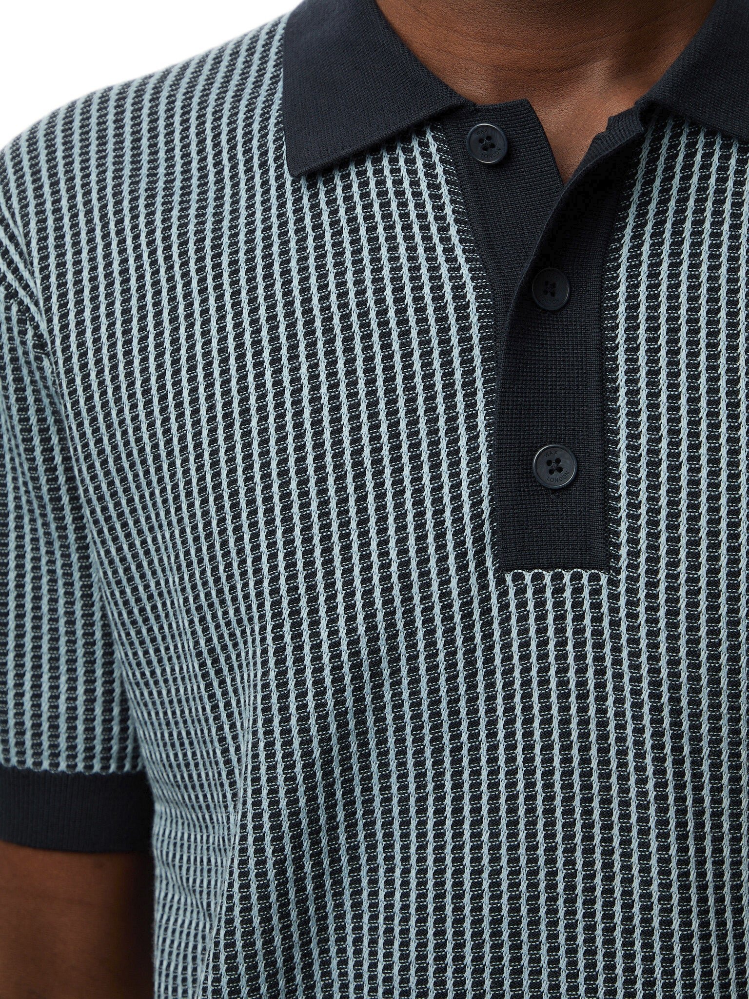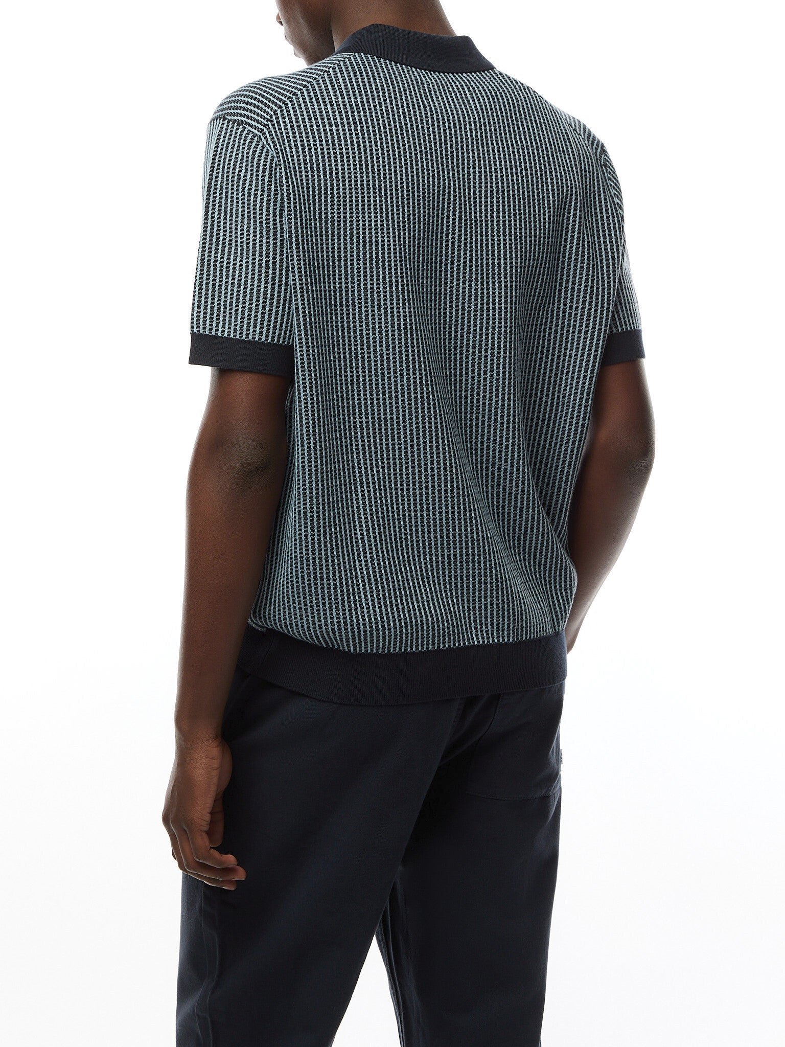 The Turnin is a turn up for the SS25 books. Cut for a relaxed fit, it’s our modern take on the classic polo shape. This version features a navy and pale blue two tone ladder stitch which creates a fine stripe design.