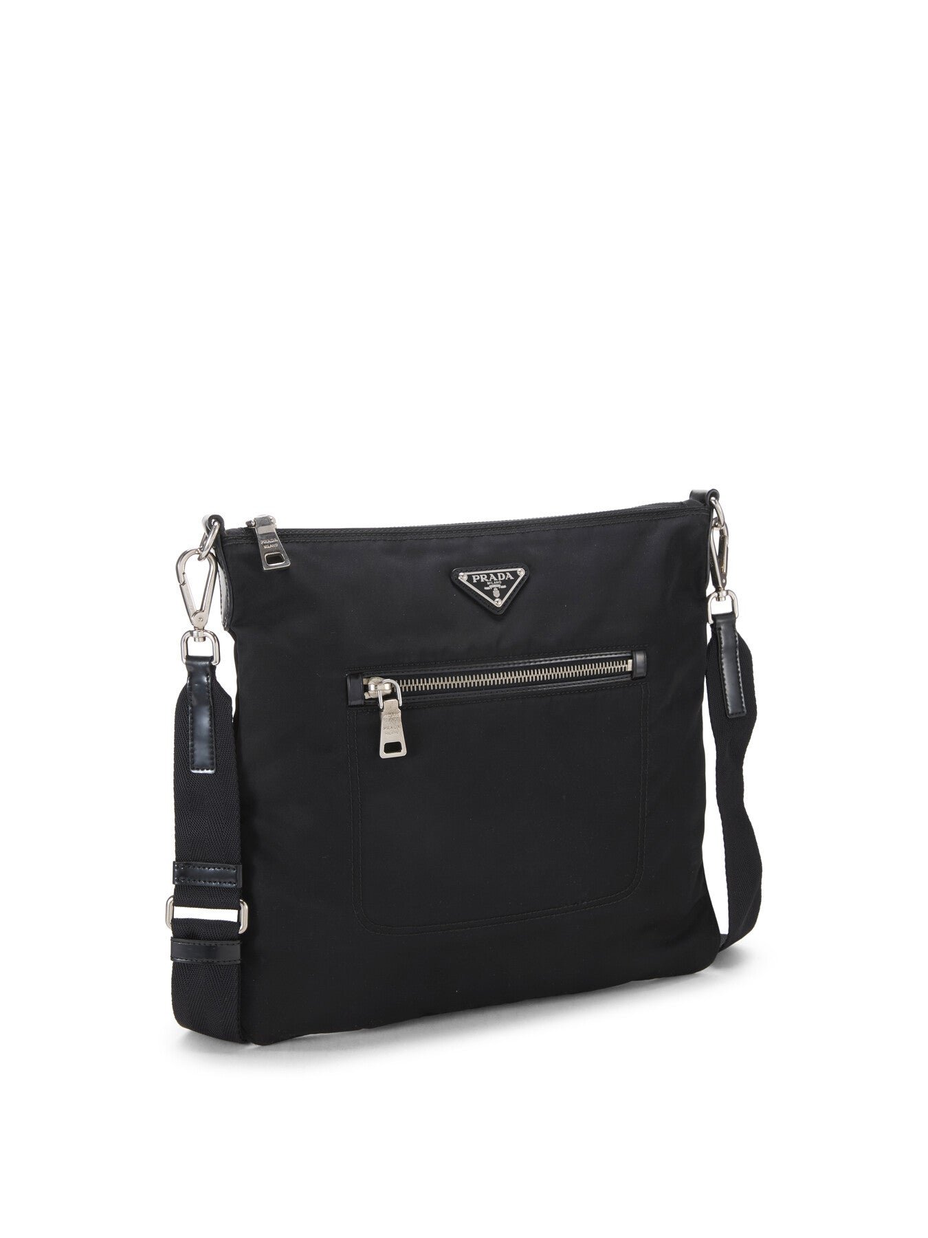 Classic messenger-style Prada bag designed in the house’s signature Tessuto nylon, featuring textured Saffiano leather trim and finished with enamel logo nameplate on front.