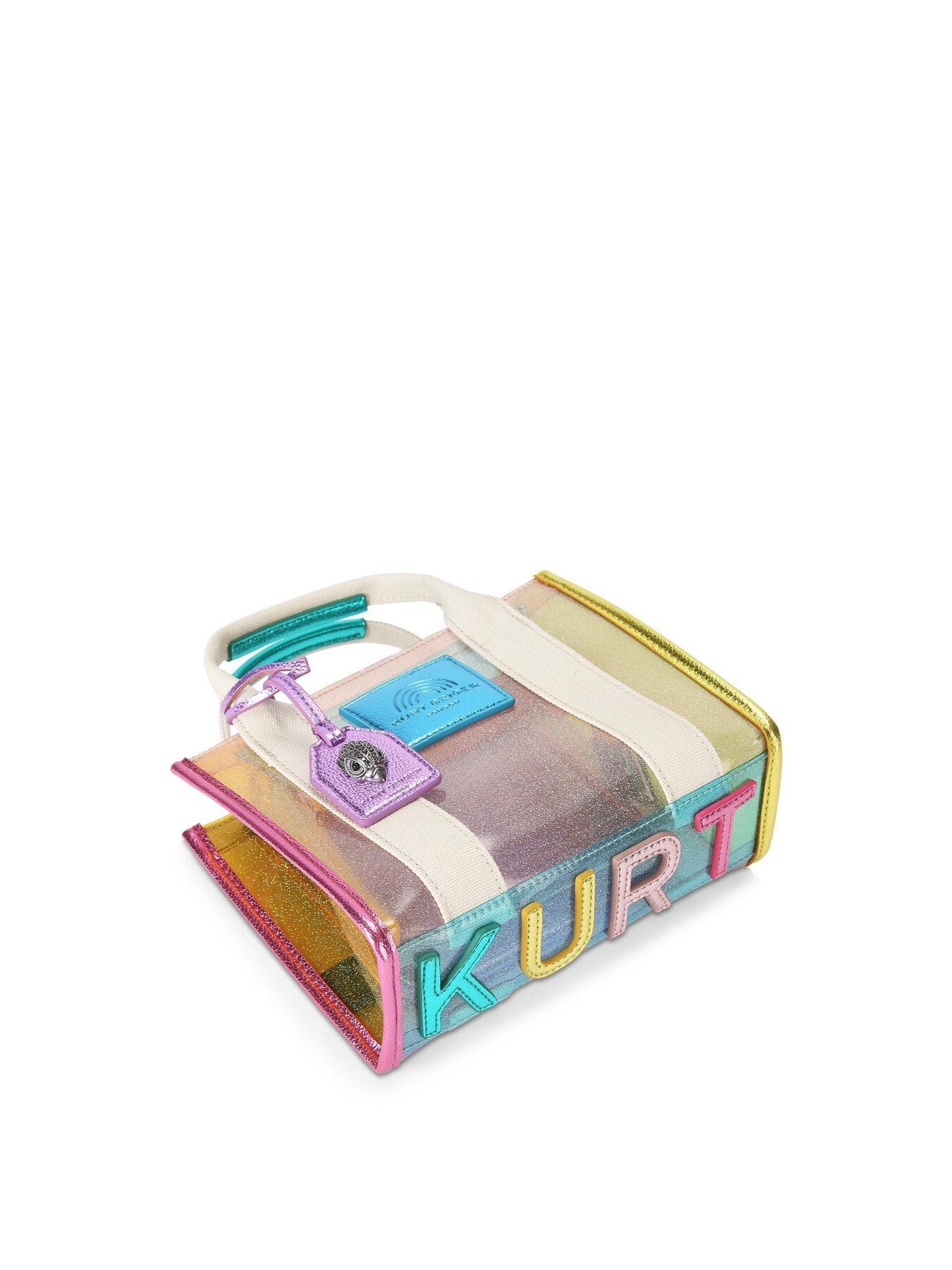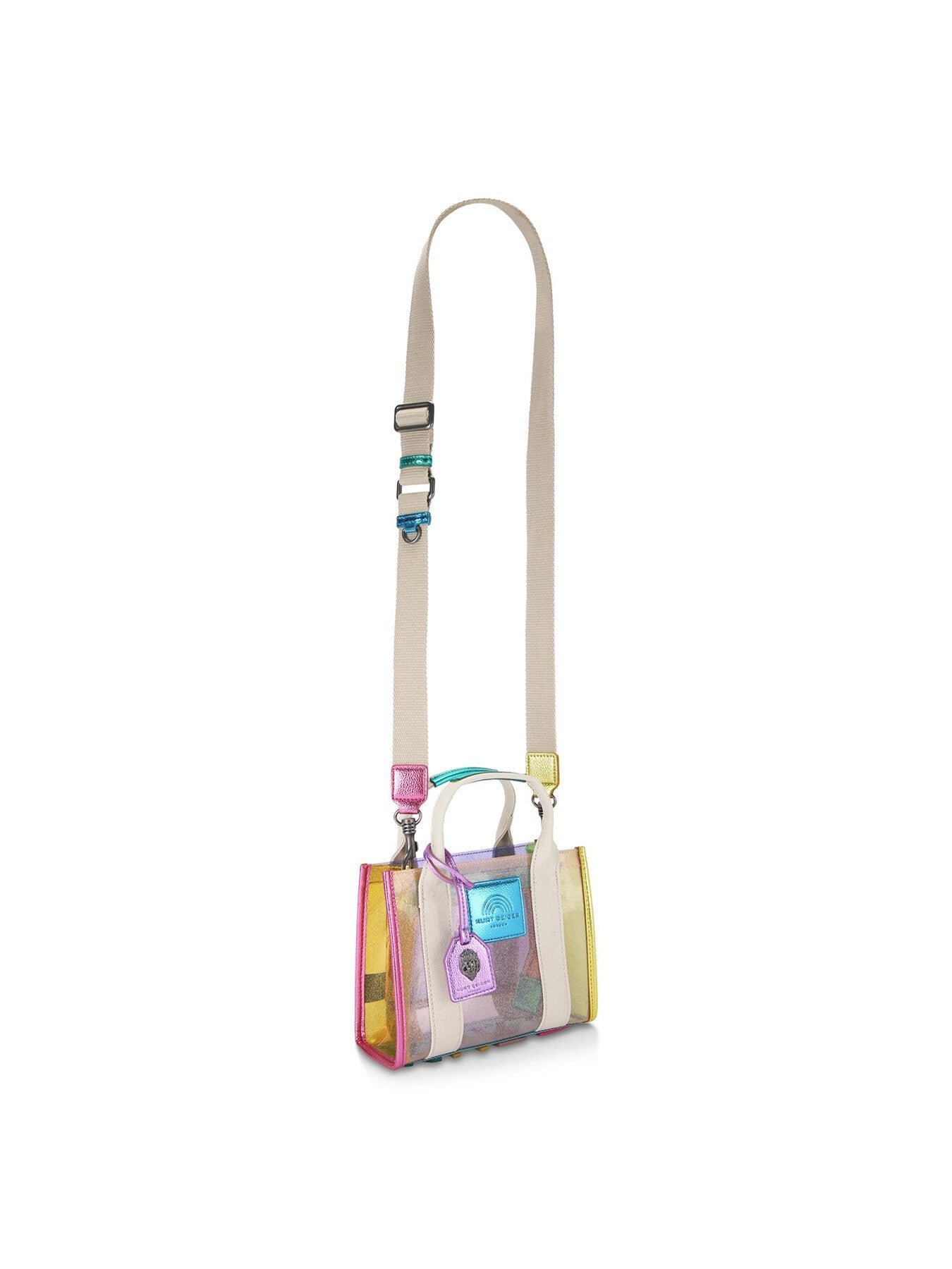 The Kurt Geiger Vinyl Mini Southbank Tote is crafted from a glitter rainbow vinyl. There are metallic trims as well as antiqued silver eagle head with crystals on the tab. Dimensions: 16cm (H), 21cm (L), 7cm (D). Strap length: 124cm.
