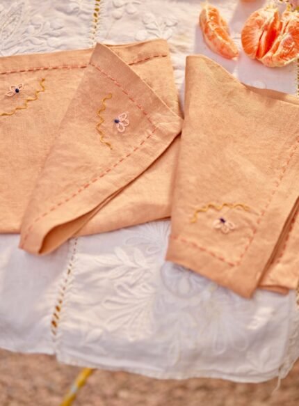 – A set of two beautifully embroidered peach linen napkins – Coloured in a carefully chosen pretty Soft Peach– Featuring
