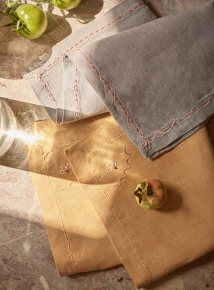 – A set of two beautifully embroidered yellow linen napkins – Coloured in a carefully chosen warm Honey Yellow– Featuring
